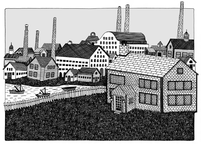points to the skyline at the far end and says, “Count the chimneys.” I make out 50 tall, black towers that heat Bury’s mills and tanneries. “Soon there won’t be a one, but you saw them,” he says, appointing me their witness and the keeper of memories of this time. I come from the rubble and fog. I taste it, sooty and acrid, as I write. I hear the cold ring of my shoes on the flagstones, rushing to stay close to the stranger just ahead in the brown overcoat.
