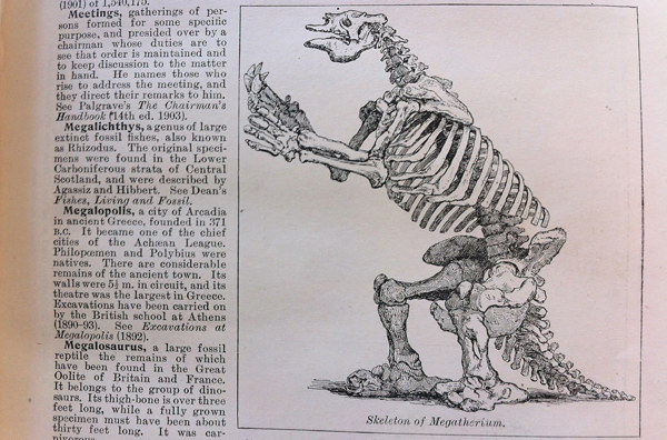 When wandering old encyclopedias, among the many wonders, wonder first at which entries bear a drawing and which do not. I get why poetry does not, but why diagram cyclone but not monsoon, or offer a portrait of Moliére and not Monet, mugwort but not mudar (they’re both plants but only mugwort merits illustration) or instead of megalosaurus, we get megatherium, skeleton of, “an extinct fossil edendate of large size, allied to the existing sloths and ant-eaters…as large as an elephant”? A skeleton’s a kind of diagram of an animal, a hopeful one, a doubtful one taken from a dream filtered through the available evidence, what we once thought this beast might look like if reassembled, with its huge, prehensile claws resembling hands.